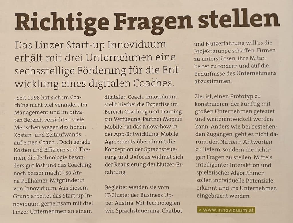 Der IT-Cluster der Business Upper Austria unterstützt eine Kooperation rund um das junge Gmundner Unternehmen Innoviduum mit einer sechsstelligen Fördersumme bei der Entwicklung eines digitalen Coaches.