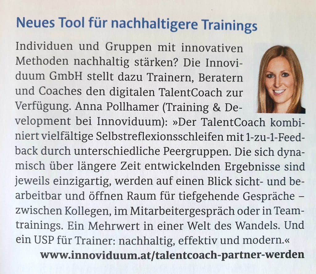 Dass Technologie und Menschlichkeit hierbei kein Widerspruch sein müssen, beweist die Innoviduum GmbH mit TalentCoach. Auf digitalem Wege können Menschen zur Selbstreflexion angeregt und beim Aufbau von wichtigen Zukunftskompetenzen unterstützt werden.