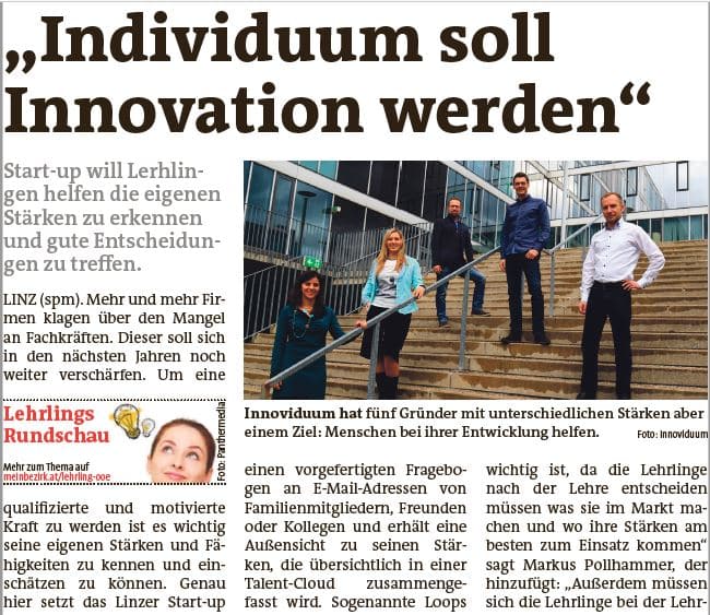 Ein junges Linzer Start-up hat sich aber jetzt zu einem Online-Weckruf für schlummernde Talente entschlossen. Innoviduum heißt das „Werkzeug“, das die fünf Oberösterreicher Anna und Markus Pollhamer, Christina und Gerald Pichler sowie Markus Lebersorger seit dem heurigen Mai Menschen zur Verfügung stellen, die einen Blick auf ihre eigenen Ressourcen werfen und so manch unbekannten „Schatz“ heben möchten.